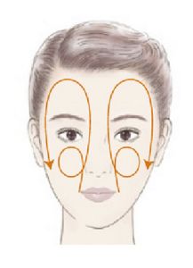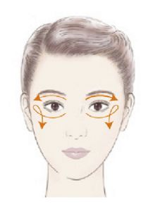 3. Slide the fingers outwards from the bridge of the nose to massage the upper eyelids. Slide the fingers outwards in an arc as if ironing out the fine lines at the corners of the eyes for the lower eyelids. Finish by sliding down towards the sides of the cheeks.