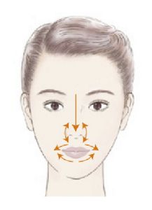 4. Slide your fingers downward along the bridge of the nose. Now, carefully move your fingers up and down along the nostrils. Around the mouth, massage above and below the lips in turn, sliding the fingers from the center outwards.